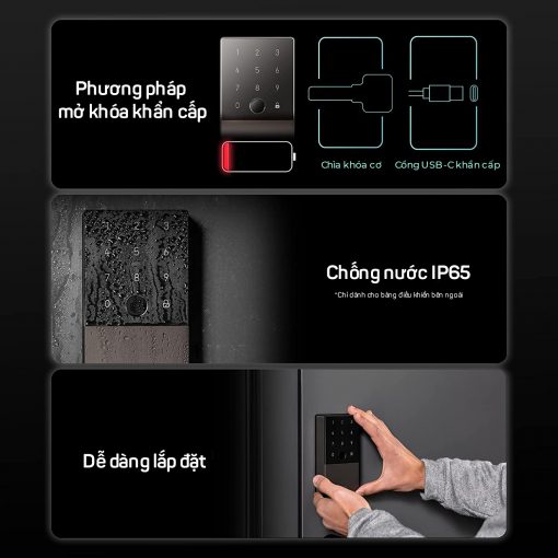 Với chỉ 4 viên pin AA, khóa có thể hoạt động liên tục đến 8 tháng. Khi sắp hết pin, thiết bị sẽ cảnh báo và bạn có thể cấp nguồn tạm thời qua cổng USB-C để tiếp tục sử dụng.